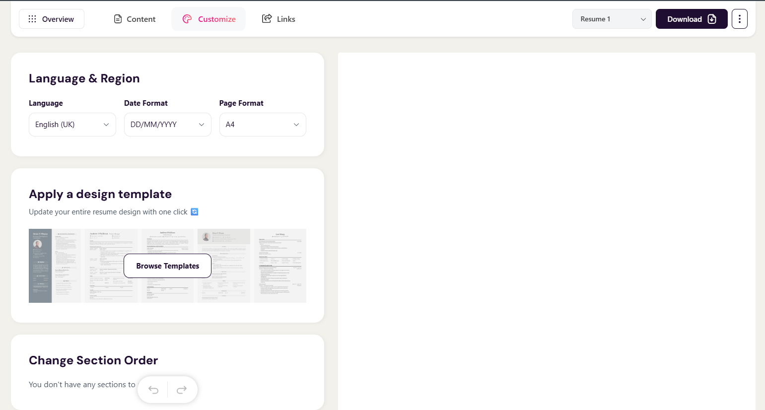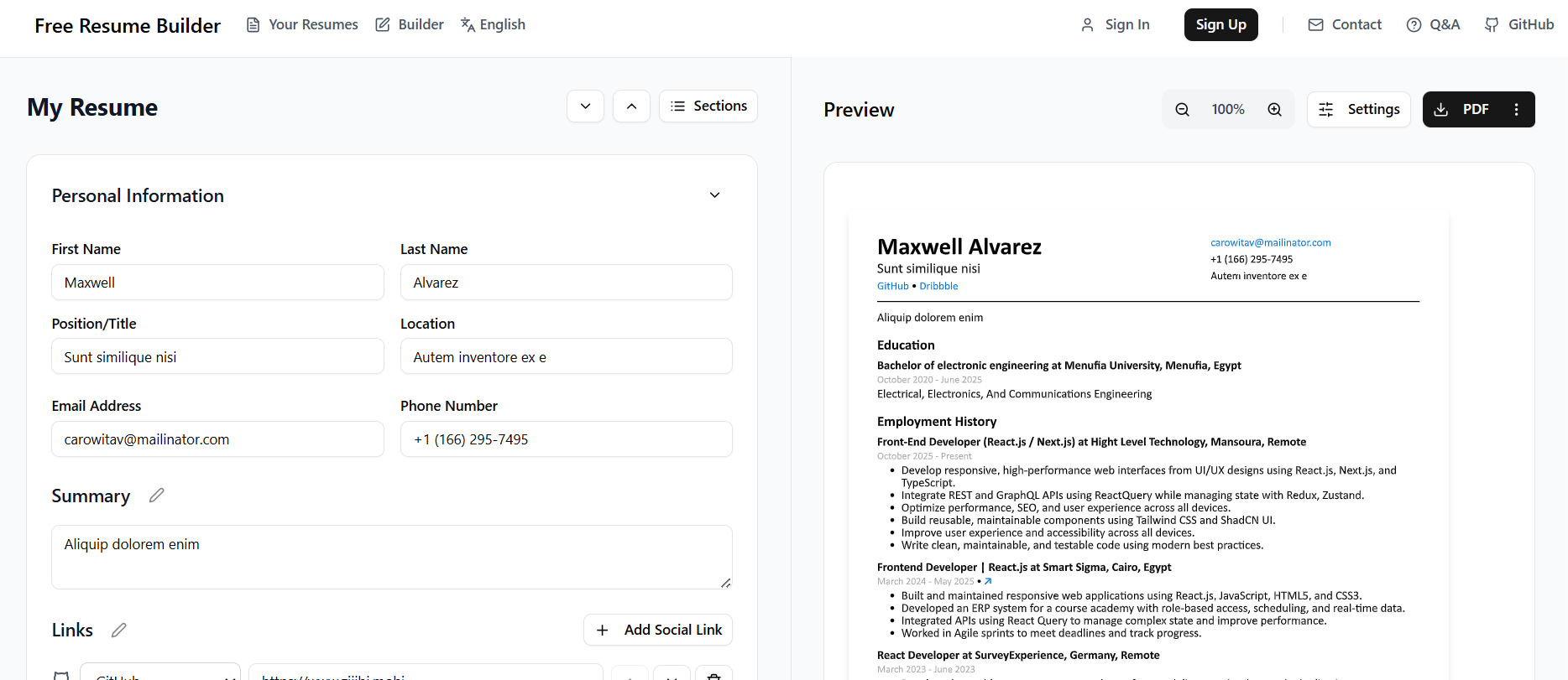 ResumeForFree is one of the easiest and fastest free resume builders available. It’s perfect if you want a resume without complicated settings or unnecessary steps.
